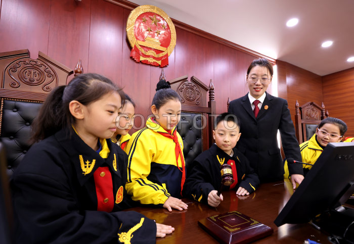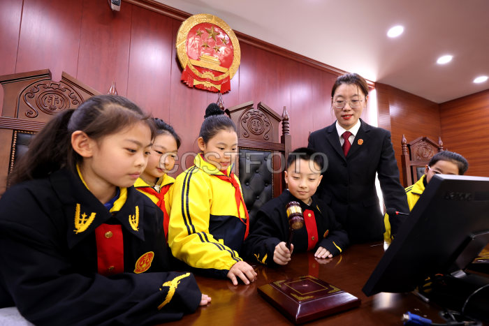 Students learn to use mallets at the trial hall of Shizhong District People's Court in Zaozhuang, East China's Shandong province, Dec 2, 2023.