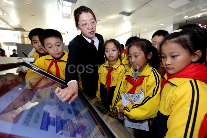2023年12月2日,在山东省枣庄市市中区人民法院,法官在诉讼服务中心为小学生讲解法院的立案流程。(王海楠 陈灿/Costfoto,版权作品,严禁转载)