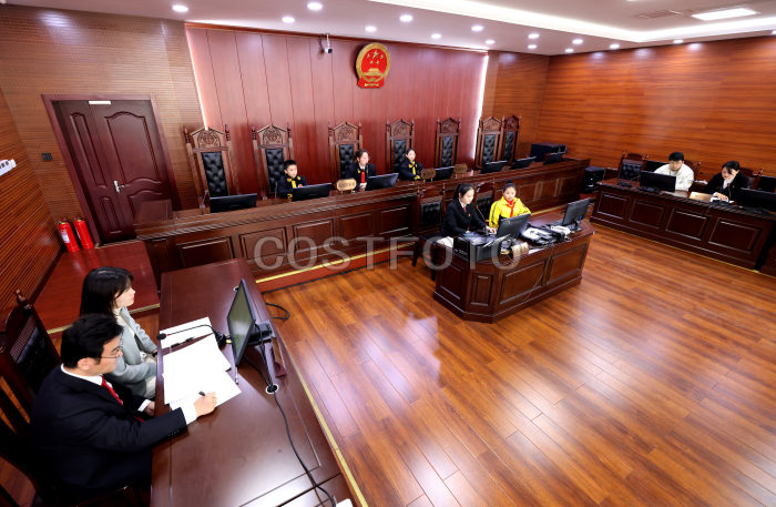 2023年12月2日,在山东省枣庄市市中区人民法院审判庭,法官和小学生们在一起“模拟”审理案件。(王海楠 陈灿/Costfoto,版权作品,严禁转载)