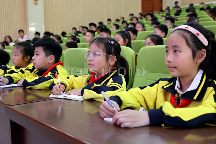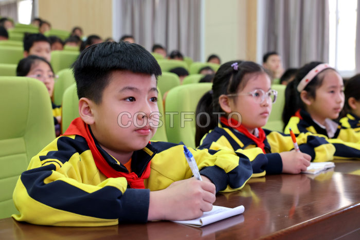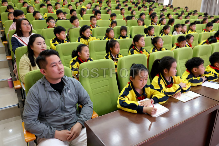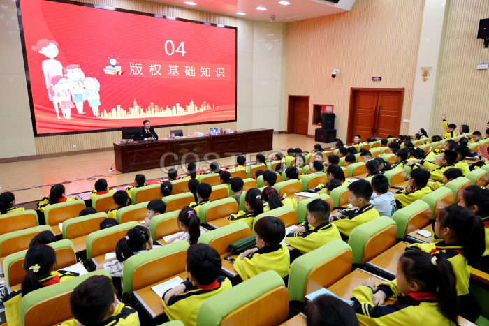 2024年4月25日,在山东省枣庄市东湖小学,师生们在认真听法官讲解的知识产权法律知识。(吉喆、彭冠华、郝立静、李娟、王蒙/Costfoto,版权作品,严禁转载)