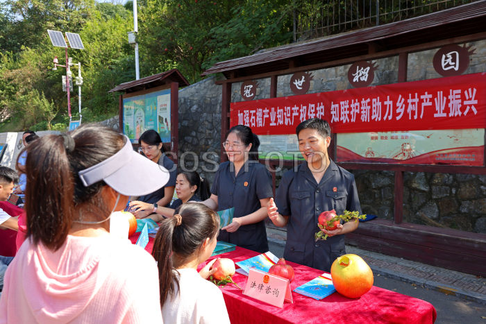 2024年9月25日,在山东省枣庄市峄城“冠世榴园”风景区,法院干警和市场监管、农业农村等执法人员向人们宣传“石榴产业知识产权保护”的相关法律知识。(吉喆 杨公平/Costfoto,版权作品,严禁转载)