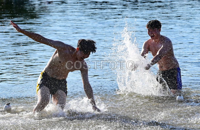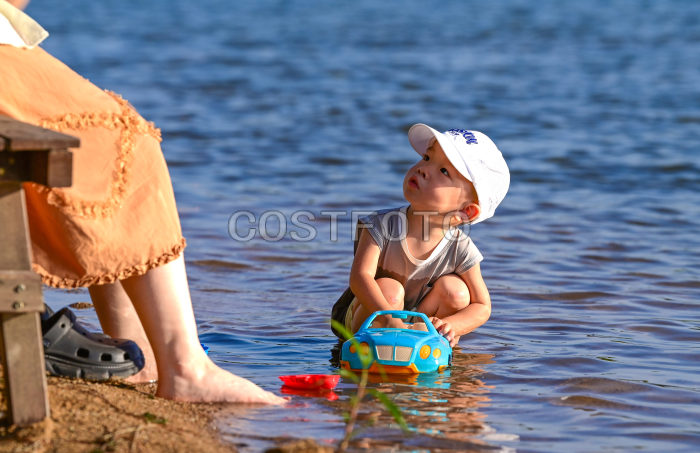 2025年7月6日,小朋友在乌兰浩特市神骏湾生态体验区儿童戏水区戏水。(王正/Costfoto,版权作品,严禁转载)