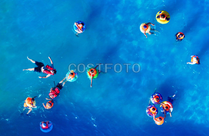 2025年7月6日,游客在乌兰浩特市神骏湾生态体验区造浪池戏水(无人机照片)。(王正/Costfoto,版权作品,严禁转载)