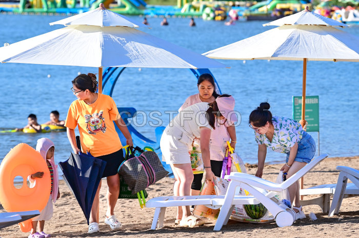2025年7月6日,游客在乌兰浩特市神骏湾生态体验区阳光沙滩区休闲。(王正/Costfoto,版权作品,严禁转载)