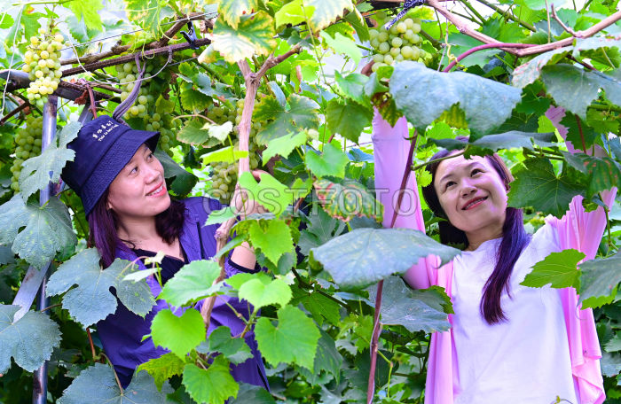 2025年7月6日,游客在乌兰浩特市神骏湾生态体验区生态农业观光园采摘葡萄。(王正/Costfoto,版权作品,严禁转载)